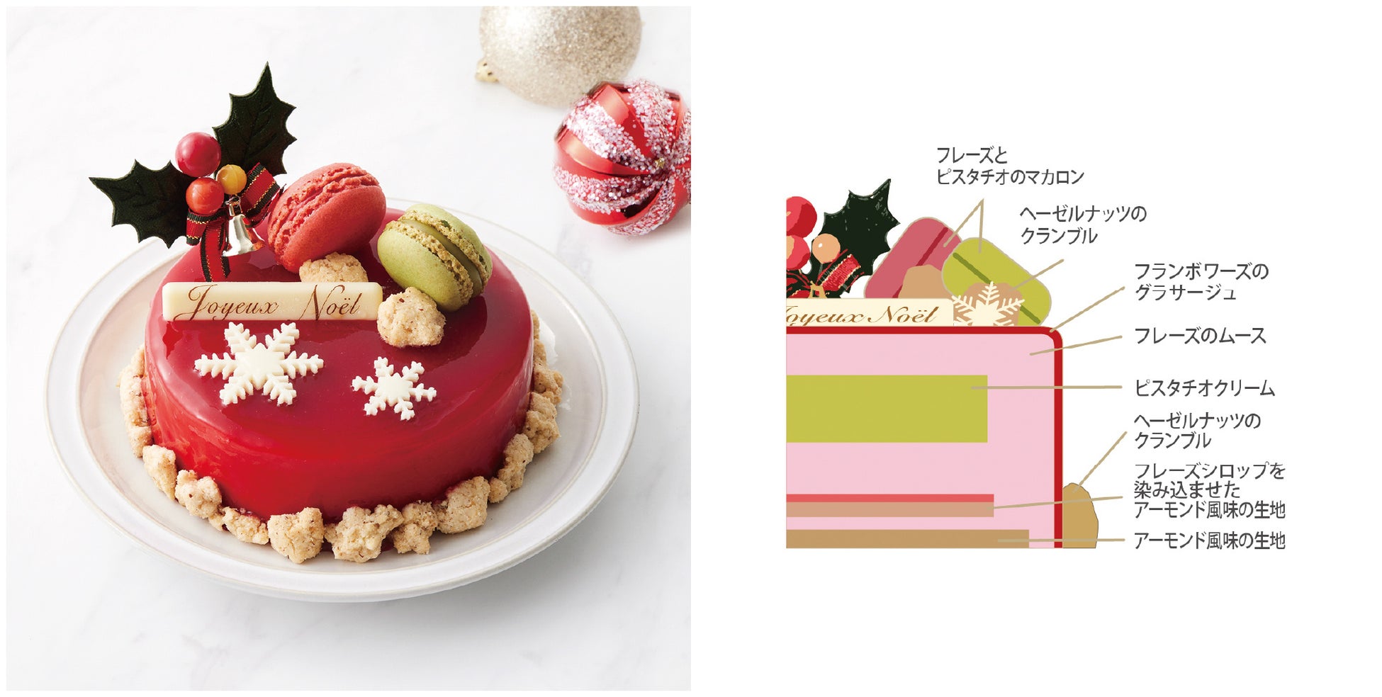 仕上げに苺とピスタチオのマカロンとヘーゼルナッツのクランブル、雪の結晶モチーフのホワイトショコラをデコレーションしました。