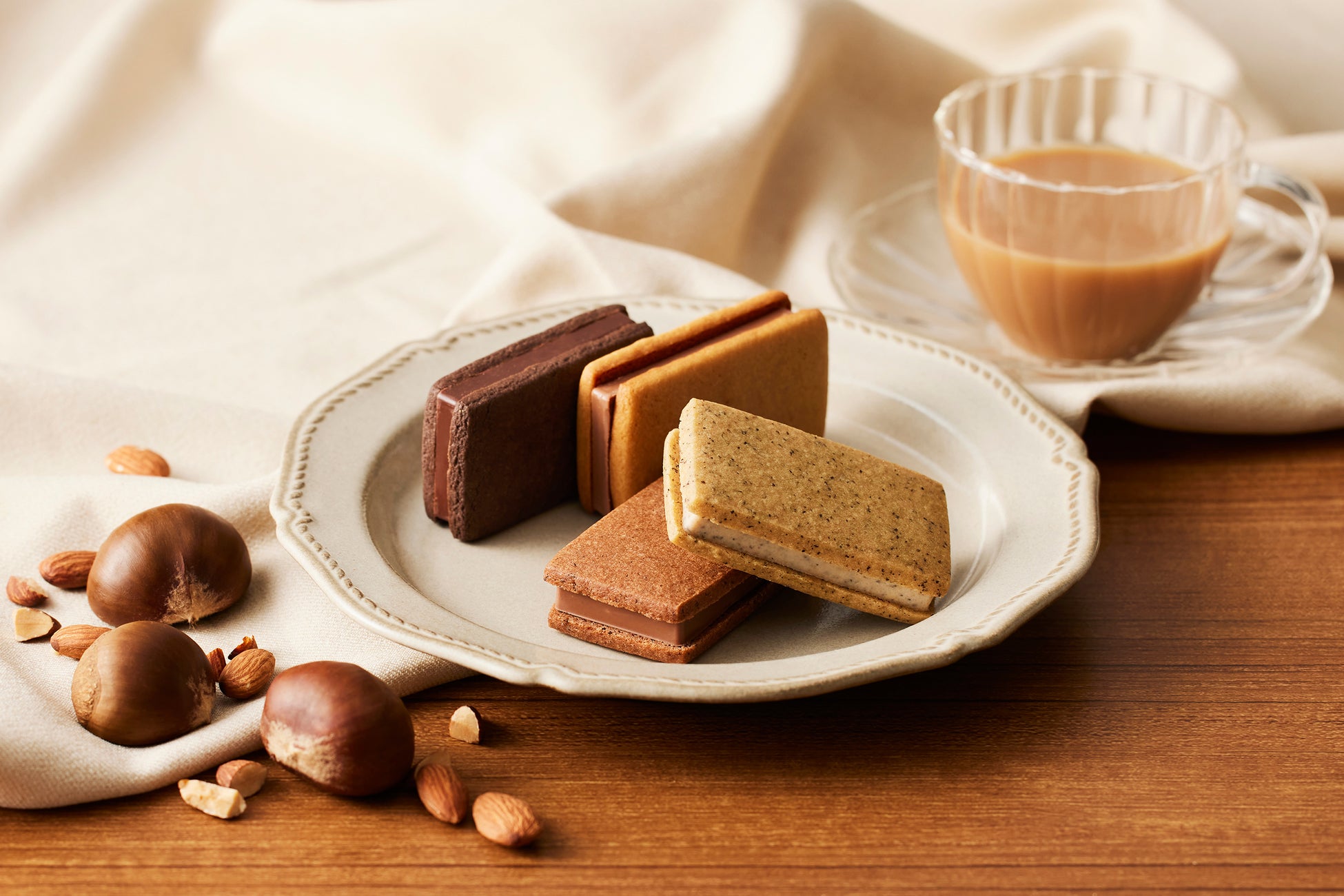 Flavor ◆ロイヤルミルクティー 紅茶風味のショコラを紅茶葉入りのクッキーでサンド ◆マロンナッツ マロン風味のアーモンド入りショコラをクッキーでサンド |