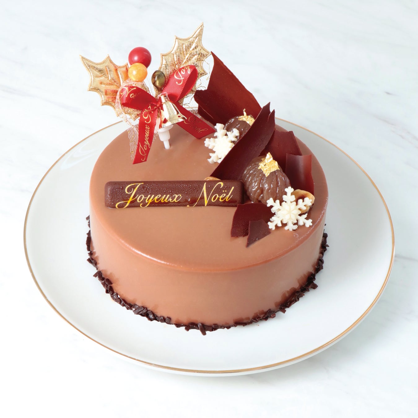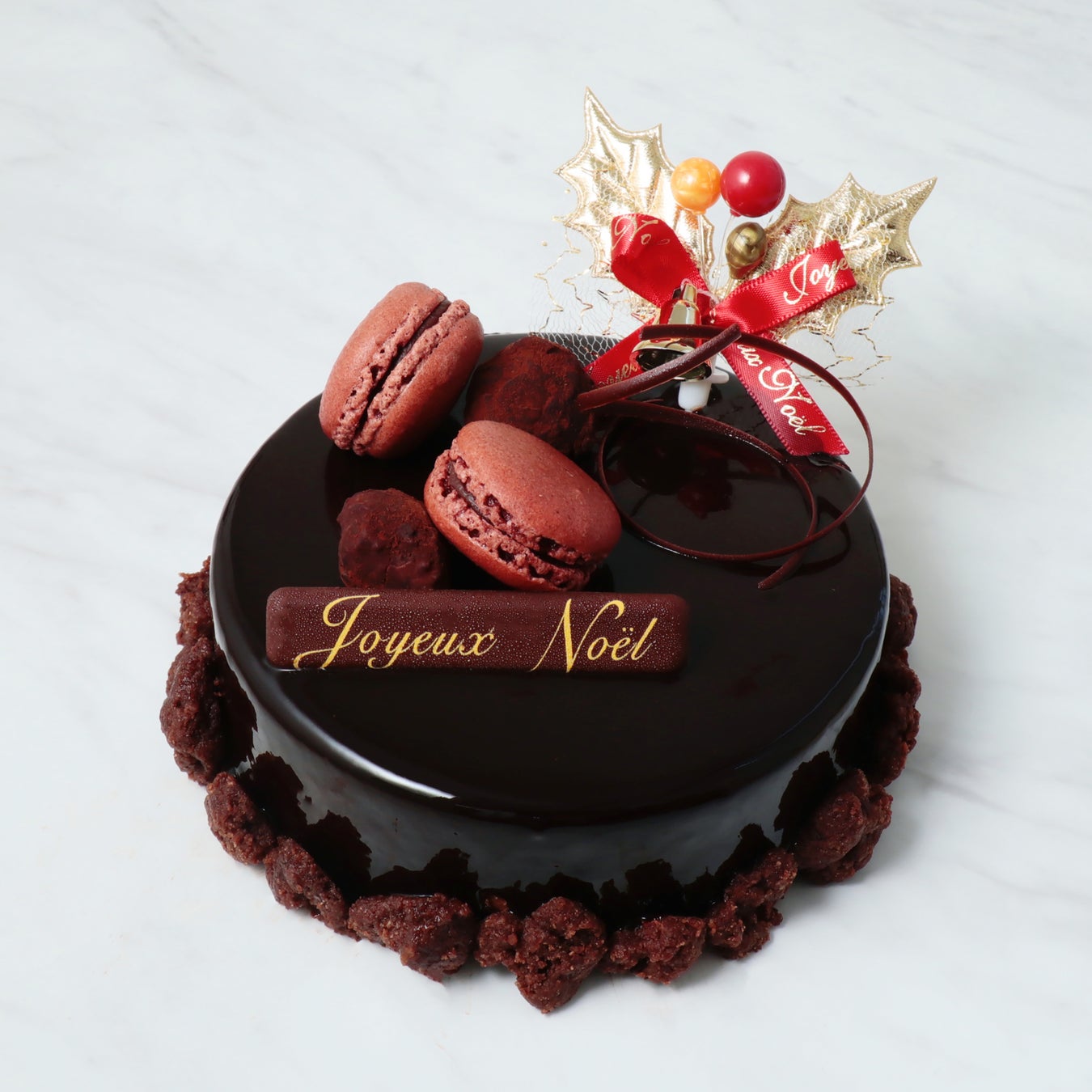 トップには、ショコラ味のマカロンやトリュフキャラメル、ヒイラギのピックを飾り、艶やかなグラサージュが一層目を引く仕上げに。
