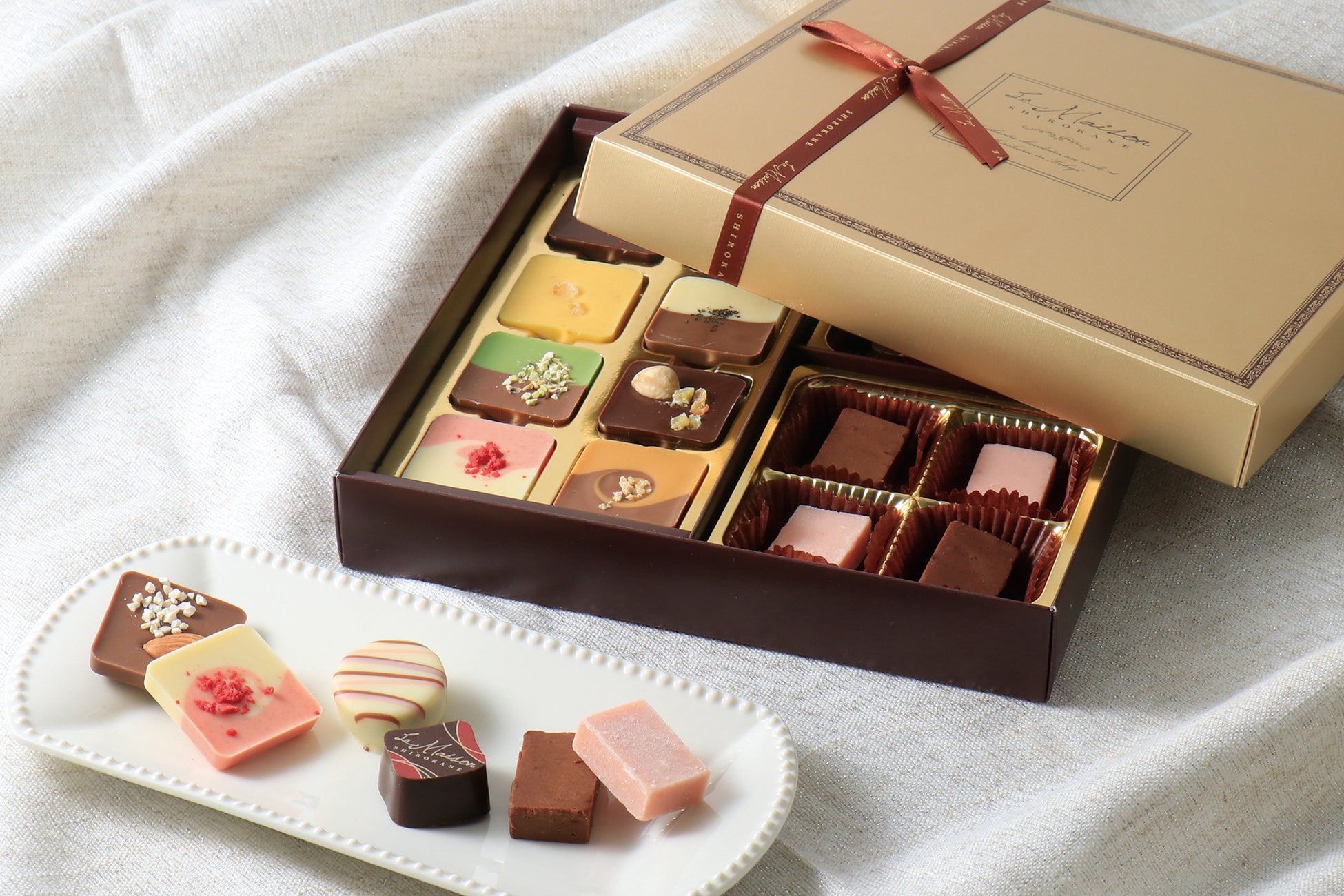 ショコラの味わいを楽しめるビターガナッシュやコクのあるピスタチオ風味のガナッシュ、甘酸っぱいストロベリーのホワイトガナッシュなど、一箱で様々なフレーバーをご堪能いただけます。