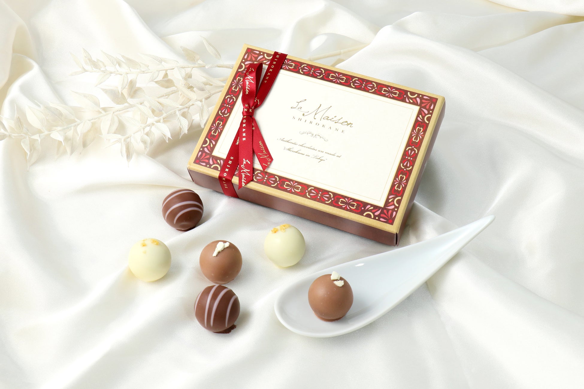 マカロン、白金ショコラ、和紅茶と果実のトリュフを入れた贅沢なアソートボックス。
